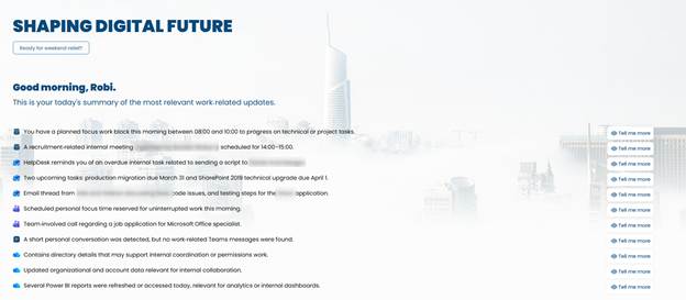 The basic idea of the solution is to create an “oasis” in the user’s workflow – a single entry point where the most important information, tasks and content that an individual needs in their everyday life are collected.