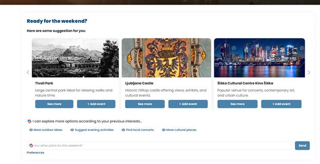 When developing the solution, we wanted to show that an intranet is not necessarily limited to work content. That’s why we’ve also added a slightly more playful Weekend Relief widget that suggests ideas for leisure activities for users.