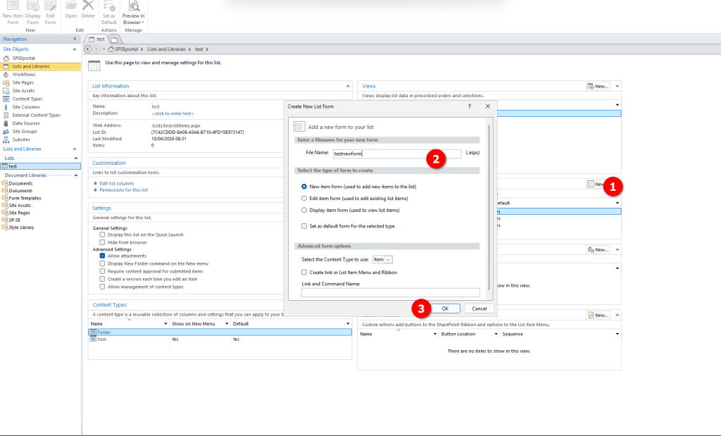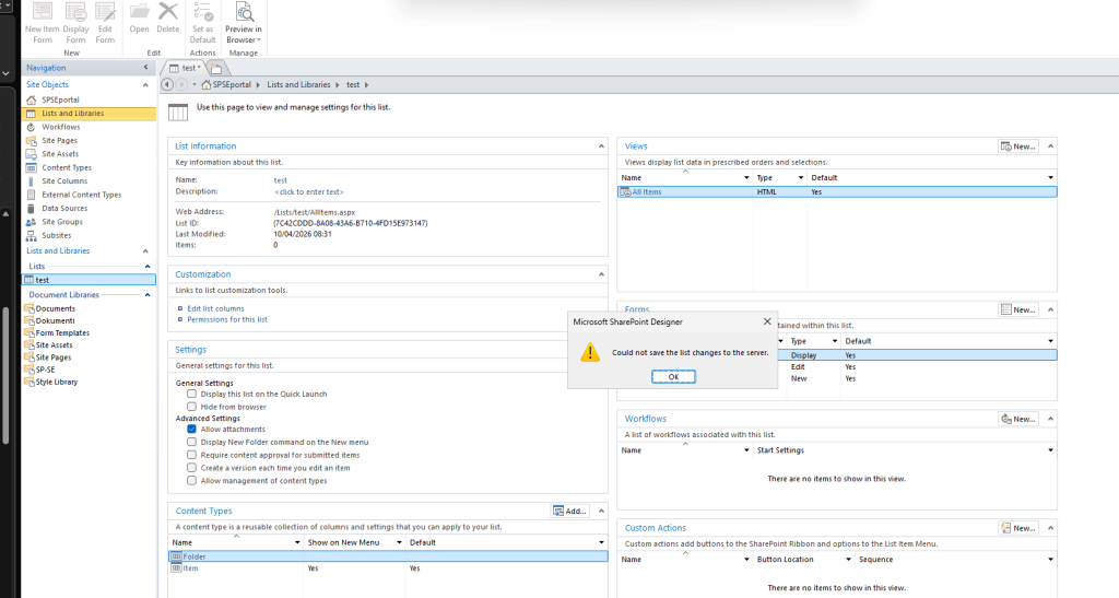 When you are trying to create a new form in SharePoint Designer, you get an error in SPD with message “Could not save the list changes to the server”